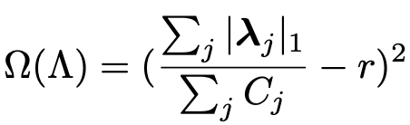 이제 이를 최적화하기 위해서는 sub-gradient method를 사용했다. Sub-gradient method는 convex지만, non-smoothd인 함수를 최적화하기 위해 사용되는 방법이다. 그런데 obj function의 lambda에 별다른 제약없이 naive L1-norm을 사용했기 때문에 좋은 pruned structure를 얻을 수 없다고 생각했다고 한다. 그래서 여기다가 하나의 제약 조건을 추가했다. Sparsity ratio를 근사하기 위해서 모든 게이트의 element-wise mean을 사용했고, 이걸 미리 정의된 sparsity ratio로 push하기 위해서 square-norm을 사용했다고 한다. 이는 다음과 같다.