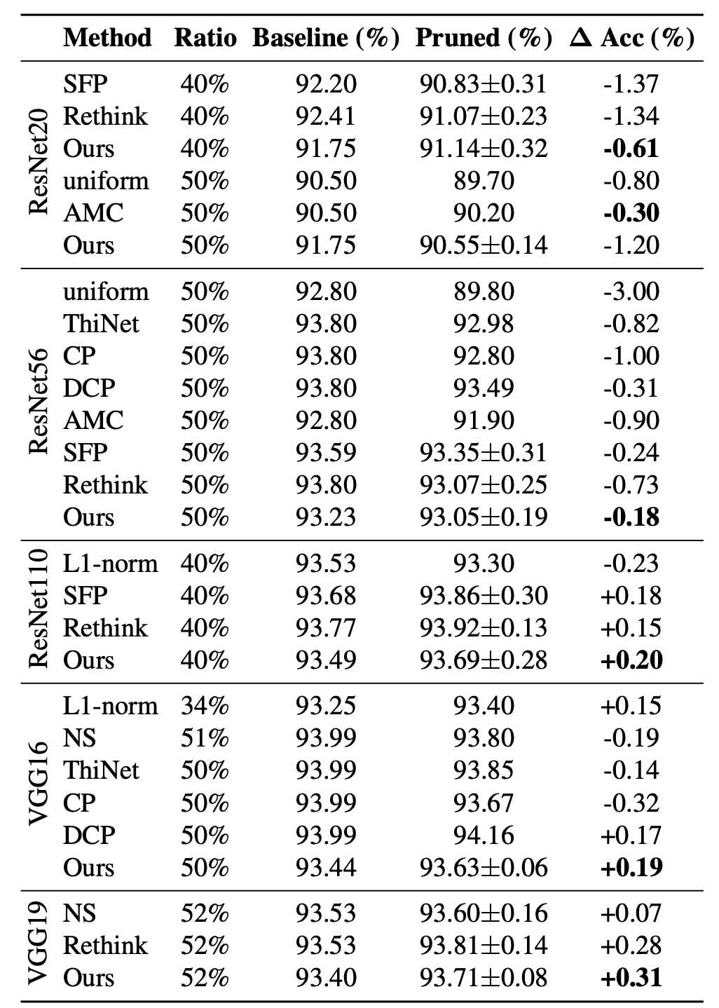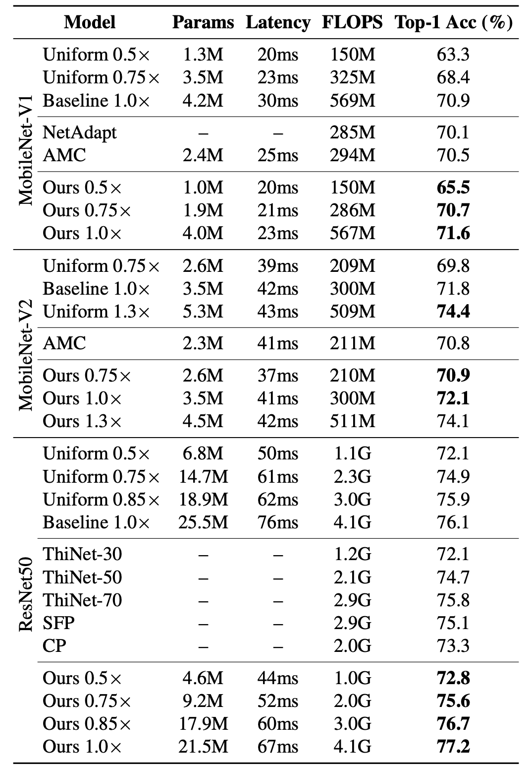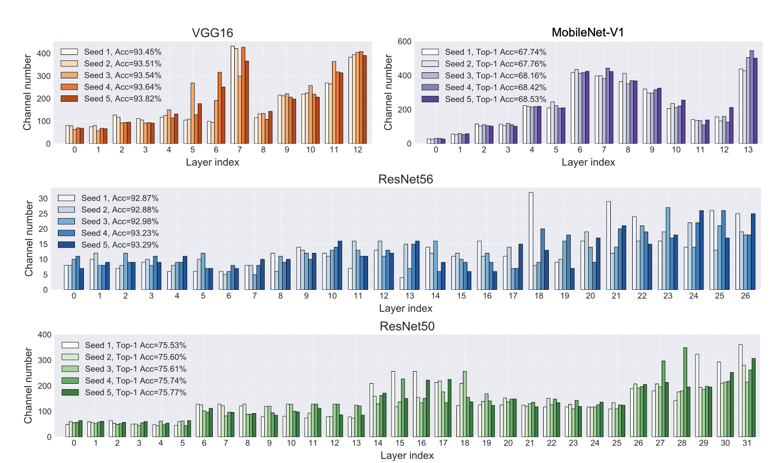 Training을 하면 시드를 바꾸더라도 채널 개수가 일정했는데, 이 방법을 이용하면 채널 개수가 비교적 다양해진다. 즉, 다양한 pruned structure를 얻을 수 있었다는 이야기다. 그러면 다양하게 얻은 pruned structure에 따른 model size나, FLOPS은 어떻게 되는지 궁금하다. 애초에 contraint를 걸어서 찾은 거기 때문에 FLOPS은 다들 비슷하게 나올 거 같긴한데.. 신기한 결과다.