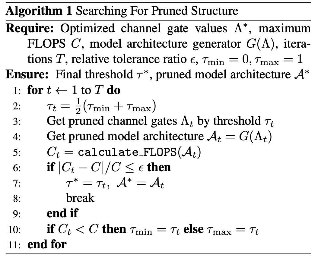 여러 번 실험을 돌려봤더니, 이 조건 없이 pruned structure를 찾아낸 것보다 나은 성능을 보이는 pruned structure를 얻을 수 있었다고 한다. 위에 식을 통해서 최적화를 하다보면, pruning을 할 target gate가 여러 개가 될 수도 있는데, 최종적으로 pruning을 할 gate는 가장 높은 validation accuracy를 보이는 것으로 골라냈다고 한다. 그리고, 최적화된 gate value를 골라내면 thresholding을 했다. 이때 network slimming과 다른 점은, network slimming에서는 parameter size에 제약을 걸어서 thresholding을 했는데 얘네는 FLOPS에 제약조건을 걸어서 thresholding을 했다고 한다. 이때 global threshold는 pruned structure가 FLOPS contraint를 만족할 때까지 이진 탐색을 통해 찾았다고 한다. Pruned structure를 찾는 탐색 전략은 다음과 같다.