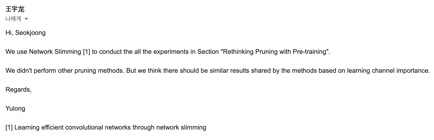 논문 말미에는 'Lottery Ticket Hypothesis'와 이를 비교하는 부분이 있다. Lottery ticket에서는 pruned model이 origianl model과 비슷하거나 더 나은 성능을 보기 위해서는 original model의 weight으로 초기화를 해야된다고 말하는데, 저자들은 그렇게 안해도 되고 random initialize하는 게 더 나은 성능을 보였다고 이야기한다. 음,, 뭔가 lottery ticket읽을 때 실험 과정에서 휴리스틱이 너무 많이 들어가서 이게 정말 되는 건가 싶었고, 직접 실험해볼 때도 더 나은 성능 보이는 게 휴리스틱없이는 쉽지 않았는데,, 이 논문을 이후로 lottery ticket에 반대되는 주장을 하는 논문들이 나올까? 기대된다.