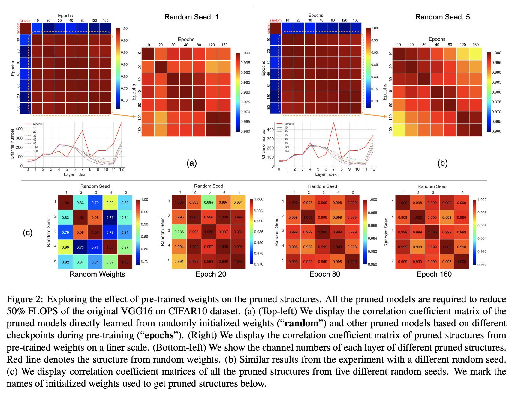 이들은 네트워크를 서로 다른 랜덤 시드를 사용해서 프루닝을 했다. 그리고난 뒤에 각 레이어에 남아있는 채널의 개수를 original network의 채널 개수로 나누어 각 레이어마다 할당되는 값을 만들었고 이들을 concat하여 벡터를 만들었다. 즉, 프루닝 이후에 남은 채널의 비율에 해당하고 네트워크에 대응되는 벡터를 하나 만든 것이다. 그러면 이제 네트워크에 대해 벡터가 두 개가 만들어졌는데, 이걸 각 epoch과 random seed마다 만들어서 correlation coefficient를 계산하고 matrix를 만들어준 것이 위의 피규어다. 보면 random seed를 달리 하더라도 epoch을 늘릴수록 correlation이 커지는 걸 알 수 있는데, 이는 pre-training이후에 다른 방법으로 pruning을 적용해도 얻을 수 있는 네트워크 구조가 유사하다는 것으로 해석할 수 있다. 논문에서는 학습을 진행함에 따라 pruned structure space 줄어들고, potential performance를 제한할 수도 있다고 말한다. 최근 'Lottery Ticket Hypothesis'나 'Rethinking value of the network pruning'과 같은 논문에서 pruning이후에 얻을 수 있는 trained-weight보다는 network architecture가 중요하다고 여겨지고 있다. 그런데 pretraining을 많이 할수록 유사한 network architecture밖에 얻을 수 없다면 이는 불필요한 과정이라고 생각할 수 있다. 이는 위의 피규어를 확인하면 알 수 있다. 피규어에 나온 matrix의 대각 성분이 모두 1이라는 점이 재밌다. Random Weights에서 direct하게 pruning을 하면 값이 제각각인 걸 확인할 수 있는데, 저자들은 이 관찰로 random weights에서 pruning을 하는 것이 훨씬 다양한 pruned architecture를 얻을 수 있음을 시사하며, 초기화 단계에서 channel pruning을 하는 방법을 제시했다.