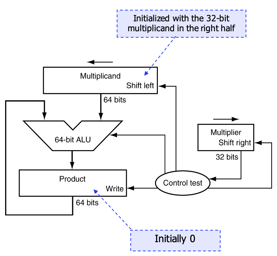 - Multiplicand register와 ALU가 32bit임. multiplier register가 필요하지 않음.