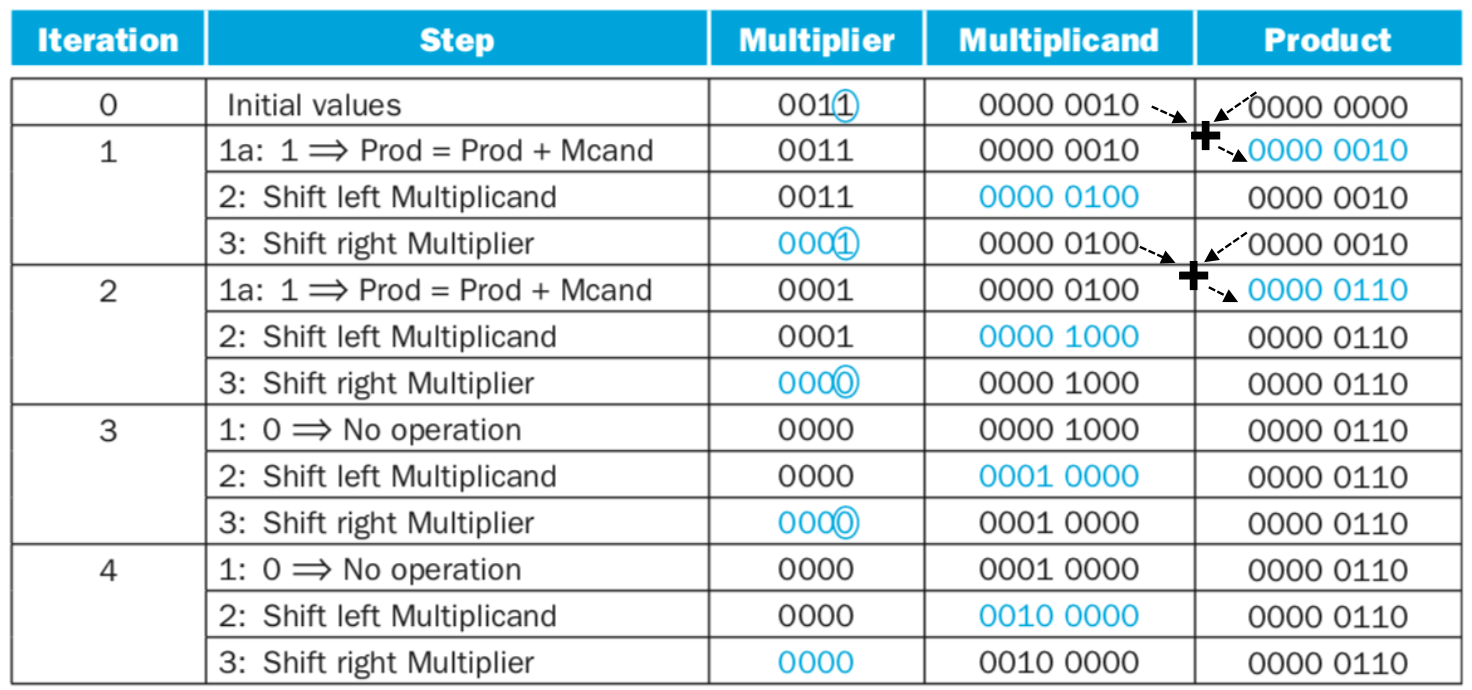 - 0010 x 0011 하는 경우를 생각. (multiplicand = 0010, multiplier = 1001), multiplicand는 매 스템마다 왼쪽으로 이동함.