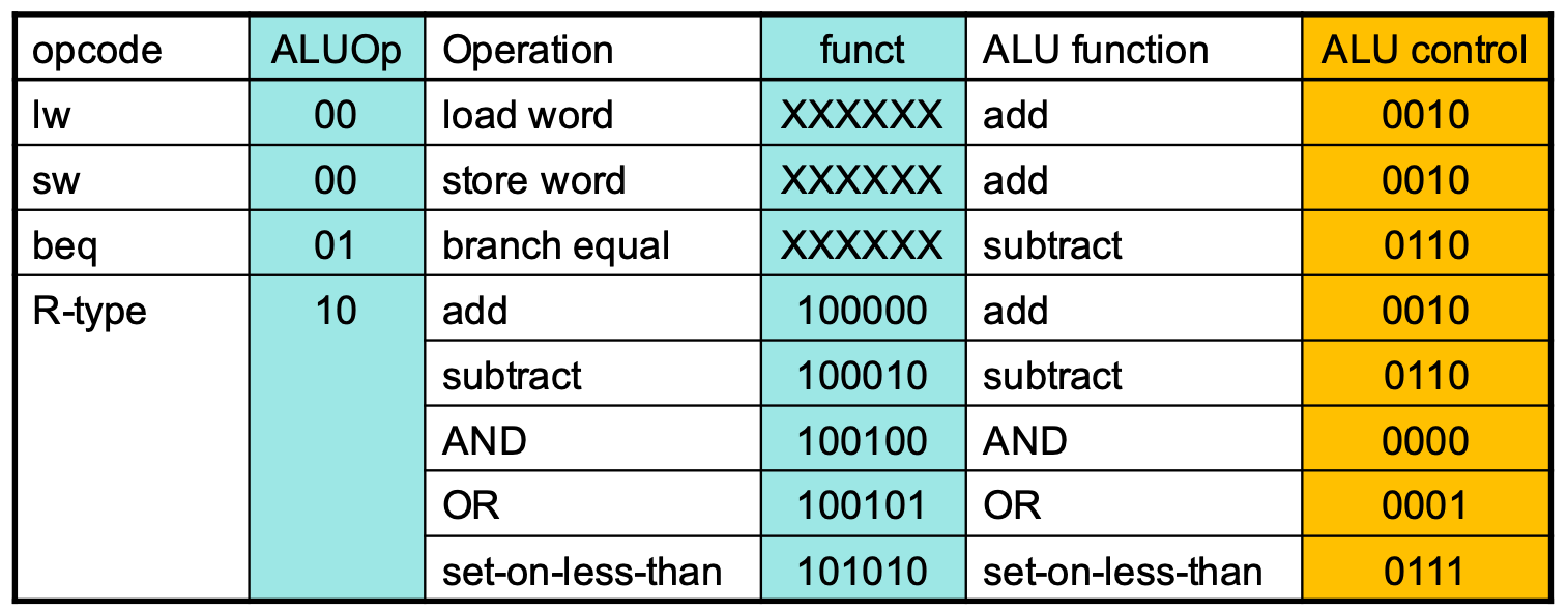 - ALU는 Load/Store 명령어에는 덧셈 연산을, Branch 명령어에는 뺄셈 연산을, R-type 명령어에는 6bit 짜리 funct field에 있는 function에 따라 연산을 함.