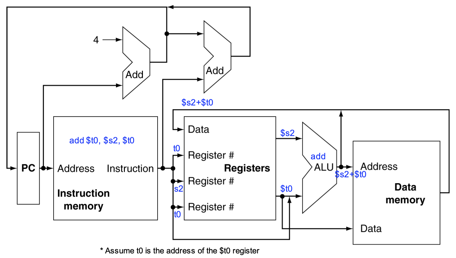 1. add 명령어와 어떤 녀석들로 연산을 할 지, 명령어 메모리 (Instruction memory)에 가져옴.